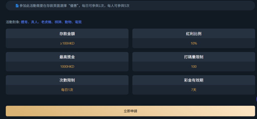5.不能和其它優惠同時申請,一次存款只能申請一個活動。