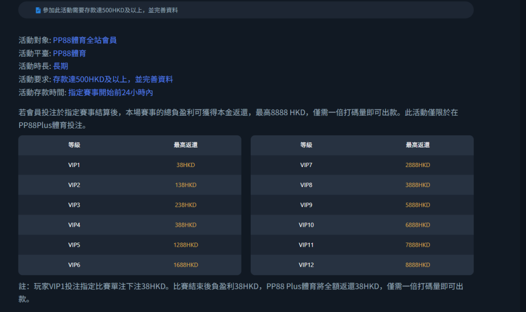 2.VIP會員等級以賽事當日 GMT+8 16:00PM 後系統等級為準。